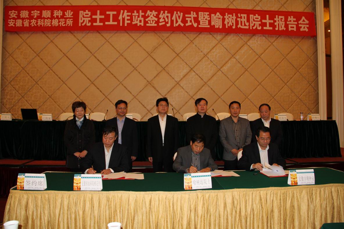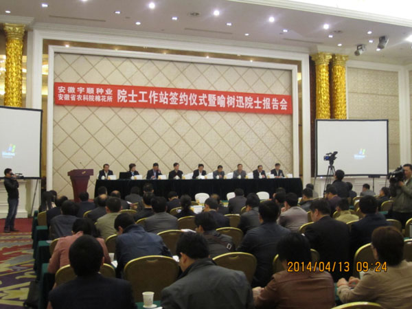 2014年4月13日上午,由中國(guó)工程院喻樹迅院士與安徽宇順種業(yè)開發(fā)有限公司、安徽省農(nóng)科院棉花所共建成立的“棉花院士工作站”簽約儀式在安慶碧桂園鳳凰酒店舉行,標(biāo)志著全市首家農(nóng)業(yè)院士工作站簽約成立。中國(guó)農(nóng)科院棉花所研究員、中國(guó)工程院院士喻樹迅,安徽省農(nóng)科院院長(zhǎng)楊劍波以及省農(nóng)業(yè)機(jī)械推廣總站、省農(nóng)科院棉花所、國(guó)家棉花長(zhǎng)江試驗(yàn)站等部門的領(lǐng)導(dǎo)專家出席簽約儀式。市農(nóng)委、市科技局、市財(cái)政局,有關(guān)縣區(qū)農(nóng)委(農(nóng)業(yè)局)負(fù)責(zé)人和相關(guān)技術(shù)人員參加簽約儀式。簽約儀式由市政府副秘書長(zhǎng)張仕慶主持。市政府副市長(zhǎng)張小青在儀式上指出,安慶農(nóng)業(yè)基礎(chǔ)較好,是國(guó)家農(nóng)業(yè)部確定的棉花優(yōu)質(zhì)生產(chǎn)區(qū)域,現(xiàn)已發(fā)展為全國(guó)棉花紡織精品生產(chǎn)基地,我市的望江縣和宿松縣是全國(guó)著名的棉花百?gòu)?qiáng)縣。他強(qiáng)調(diào),院士工作站的成立契合我市農(nóng)業(yè)領(lǐng)域正在實(shí)施的“5211”工程,必將進(jìn)一步提升我市棉花生產(chǎn)儲(chǔ)運(yùn)能力和科技科研水平,為實(shí)現(xiàn)我市乃至我省棉花生產(chǎn)方式的根本變革提供技術(shù)支撐,也必將推進(jìn)我市農(nóng)業(yè)產(chǎn)業(yè)化整體水平。