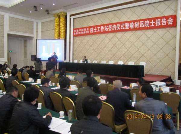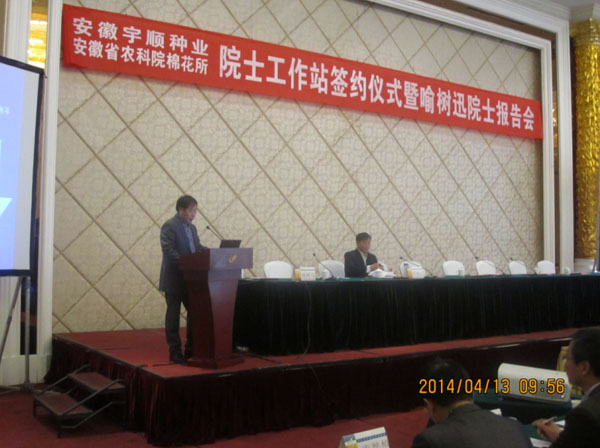 2014年4月13日,安慶市首家農業(yè)院士工作站在安慶碧桂園鳳凰酒店正式簽約成立,簽約儀式結束后,喻樹迅院士做了題為“快樂植棉與生態(tài)保護”的專題報告,報告會由安徽省農科院棉花研究所路曦結所長主持。