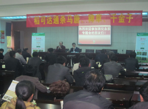 2014年4月21日“新品種農(nóng)藥推薦會”在我公司隆重召開。參加推薦會有各縣及郊區(qū)農(nóng)技站及種田大戶60余人,主要推薦產(chǎn)品有:北京燕化“10%稻可達(dá)”(五氟磺草胺·精惡唑);揚(yáng)州蘇靈“10%寶刀”(甲維·茚蟲威);浙江上虞“10%阿維·甲氧蟲酰肼”;北京富力特“34%稻尊”(噻蟲嗪·茚蟲威);江西珀爾“10%珀銳”(多殺霉素)。
