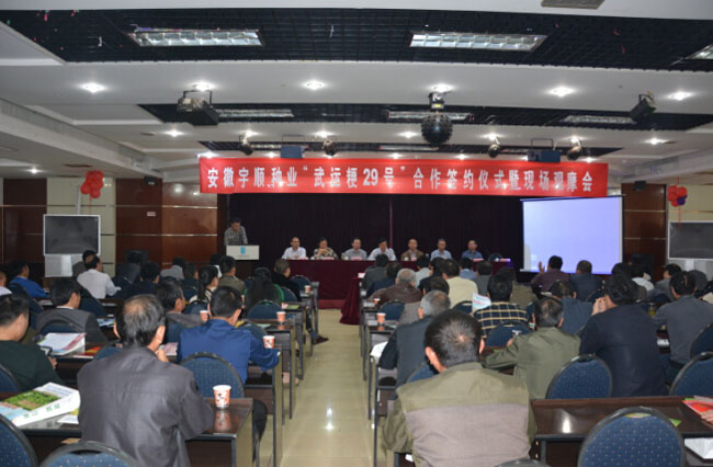 2014年10月19日上午,安徽宇順?lè)N業(yè)開發(fā)有限公司“武運(yùn)粳29號(hào)”合作簽約儀式暨現(xiàn)場(chǎng)觀摩會(huì)在合肥肥西三河國(guó)際大酒店隆重召開。