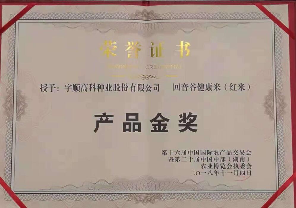 我司自主研發(fā)生產(chǎn)的“回音谷健康米(紅米)”繼中國安徽名優(yōu)農(nóng)產(chǎn)品暨農(nóng)業(yè)產(chǎn)業(yè)化交易會榮獲參展產(chǎn)品金獎之后,2018年11月4日,再次榮獲“第十六屆中國國際農(nóng)產(chǎn)品交易會暨第二十屆中國中部(湖南)農(nóng)業(yè)博覽會”產(chǎn)品金獎。