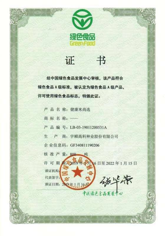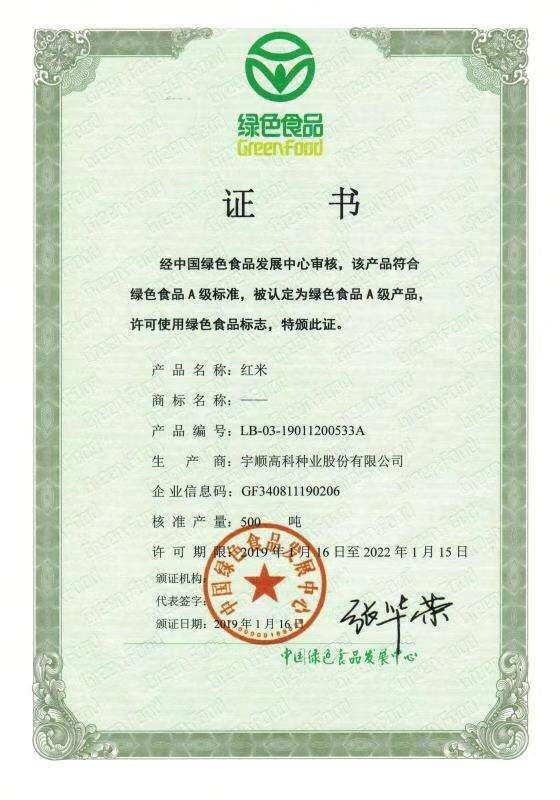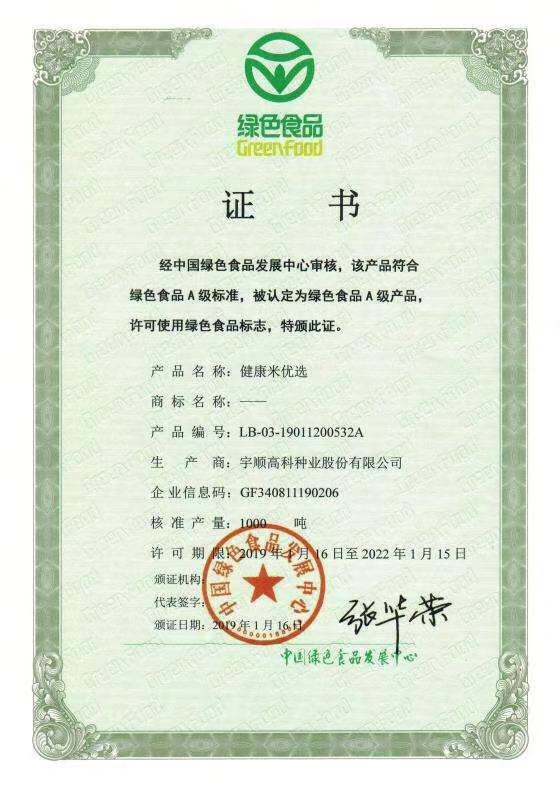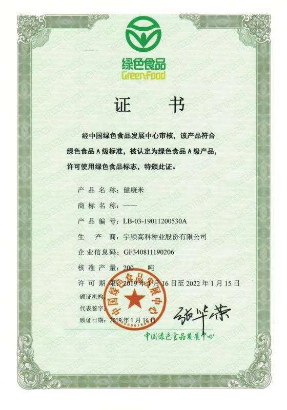 熱烈祝賀我公司健康米、健康米優(yōu)選、健康米尚選、紅米、優(yōu)質(zhì)紅米五項產(chǎn)品通過中國綠色食品發(fā)展中心審核,獲得綠色食品證書!